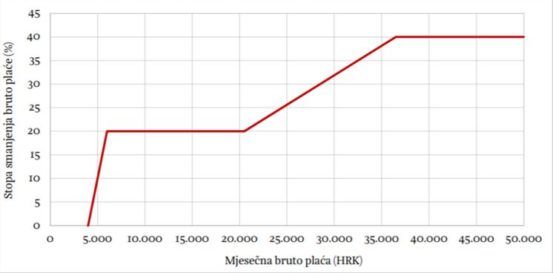 Navedeni scenarij pretpostavlja da se bruto plaće do razine od 4.500 kune ne smanjuju, a od tog iznosa da smanjenje progresivno raste do iznosa bruto plaće od 36.500 te da na toj razini iznosi 40 posto bruto plaće.