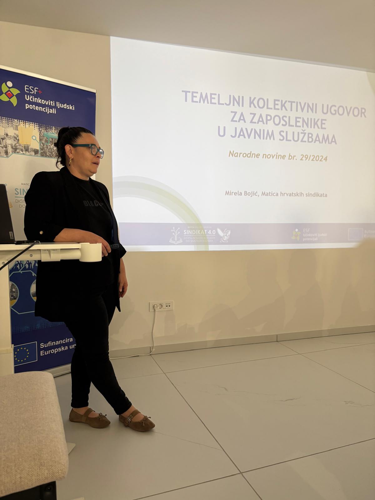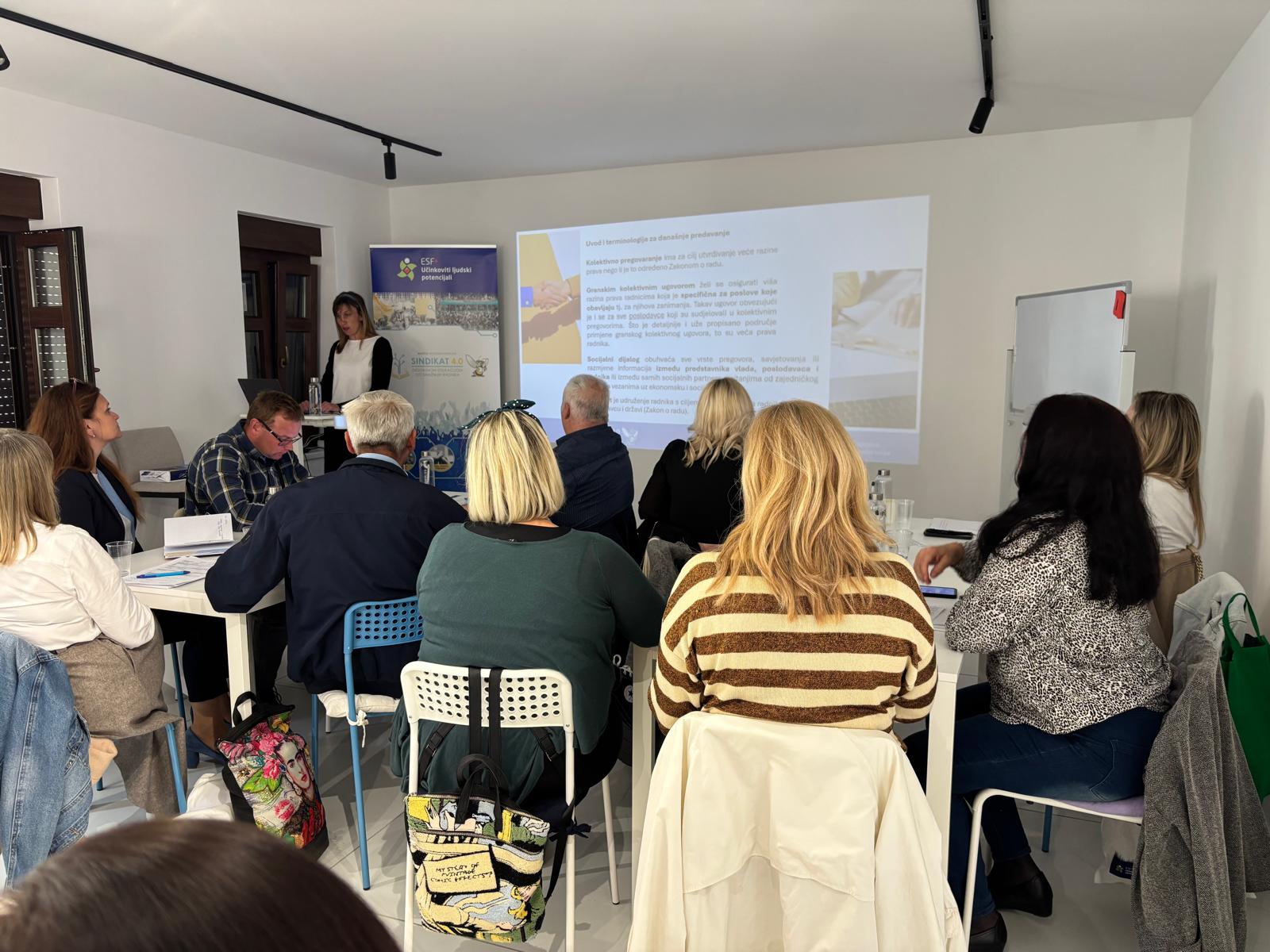 Mirela Bojić, glavna tajnica Matice hrvatskih sindikata predstavila je osnove radnog prava i ključne odredbe Temeljnog kolektivnog ugovora za zaposlenike u javnim službama, dok je Ana Tuškan, glavna tajnica Sinikata hrvatskih učitelja govorila o kolektivnom pregovaranju, socijalnom dijalogu i ulozi sindikata u tom procesu.