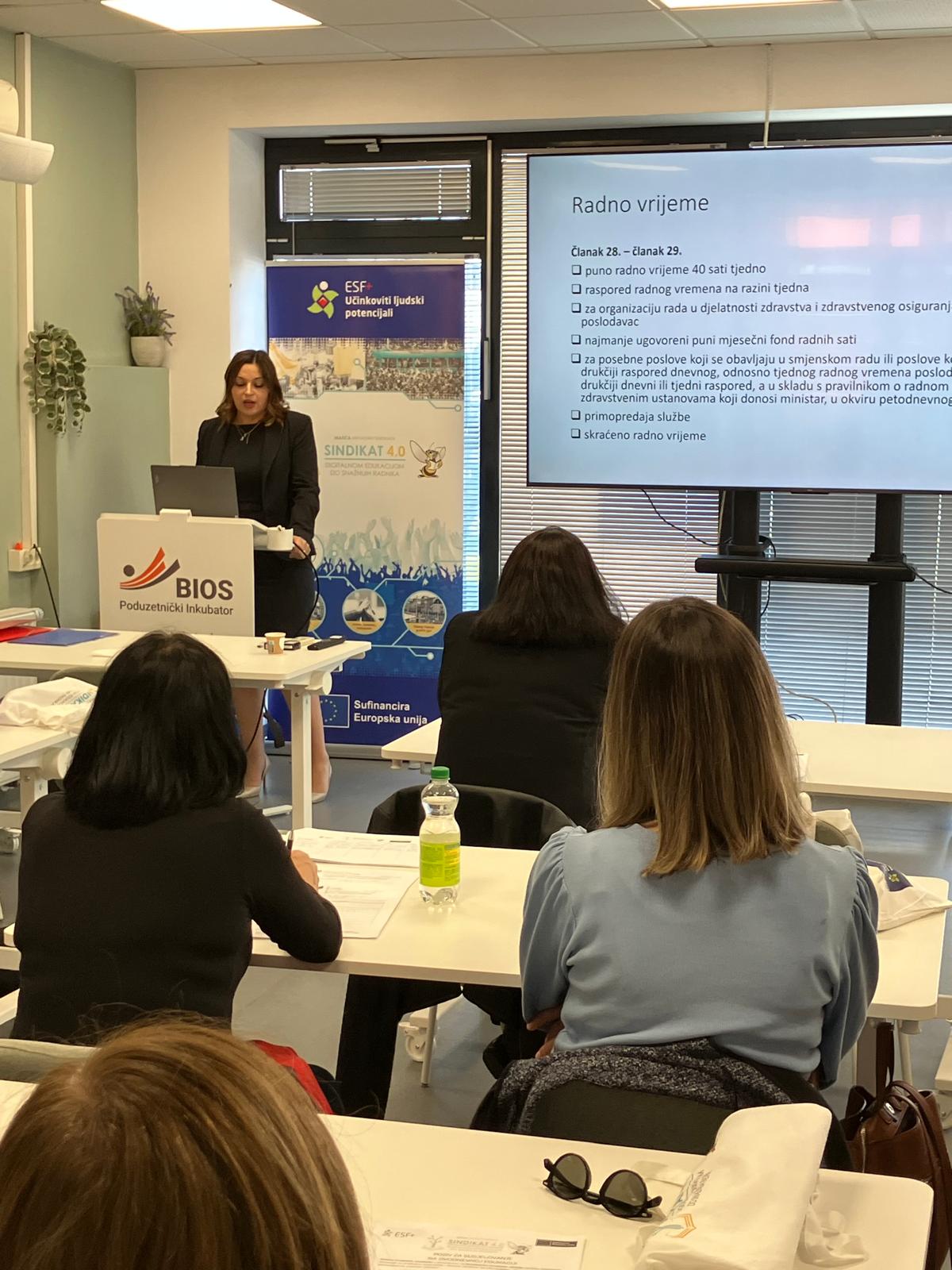 Voditeljica pravnih poslova Hrvatskog strukovnog sindikata medicinskih sestara i medicinskih tehničara Nataša Matejaš Brlić, sindikalnim povjerenicima govorila je o Kolektivnom ugovoru za djelatnost zdravstva i zdravstvenog osiguranja s posebnim naglaskom na zaštitu prava radnika i socijalnog dijaloga.