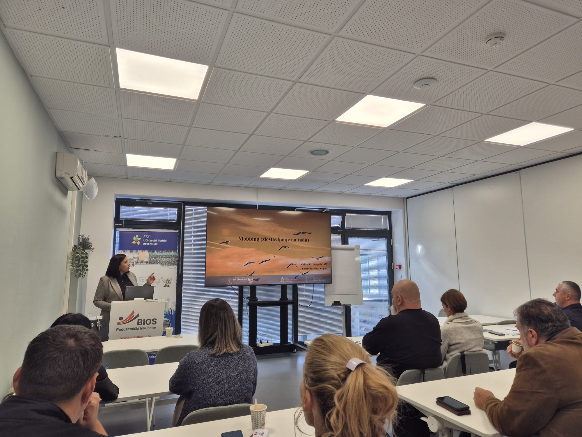 Drugi dan radionice otvorila je Suzana Blanuša, pravnica u udruzi Mobbing, koja je polaznicima objasnila pojmove mobbinga, uznemiravanja, spolonog uznemiravanja, diskriminacije i sl., te kako navedena ponašanja prepoznati, kako reagirati, kako se zaštititi…