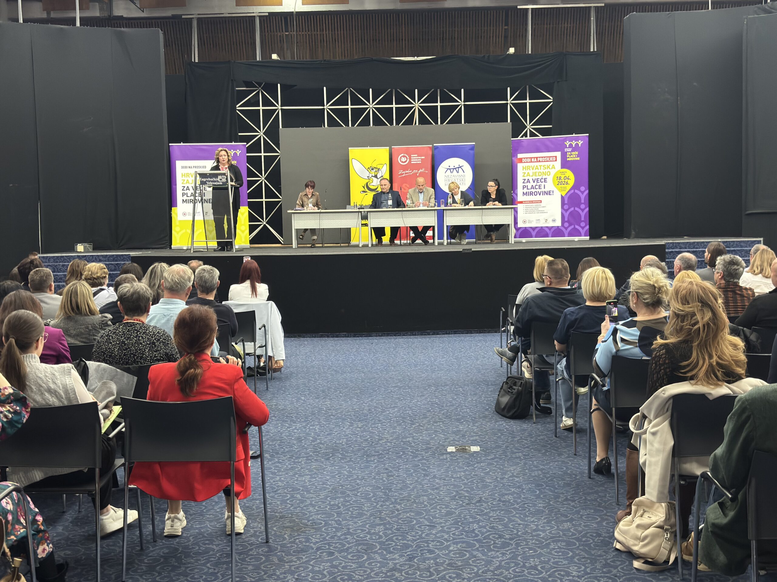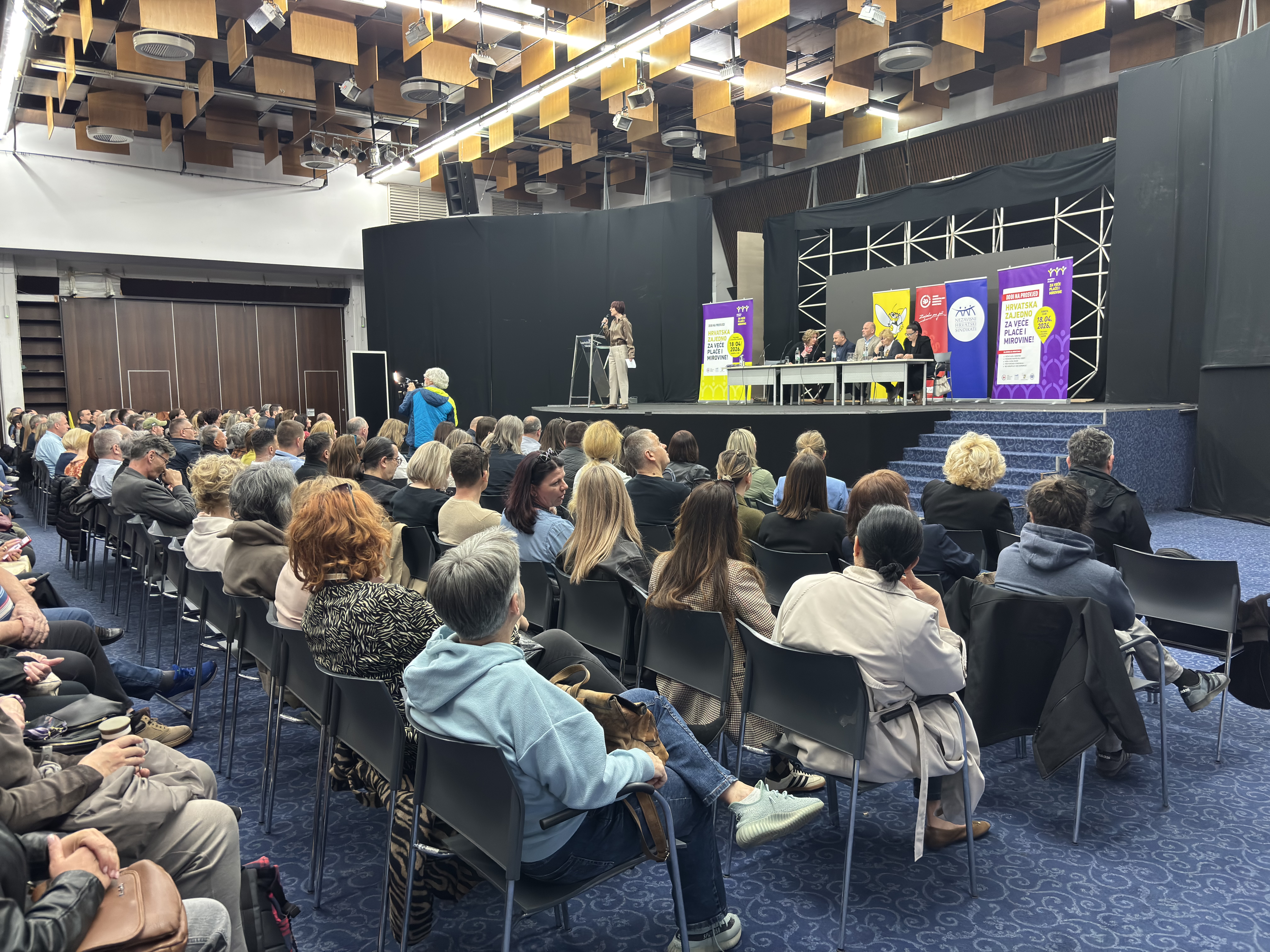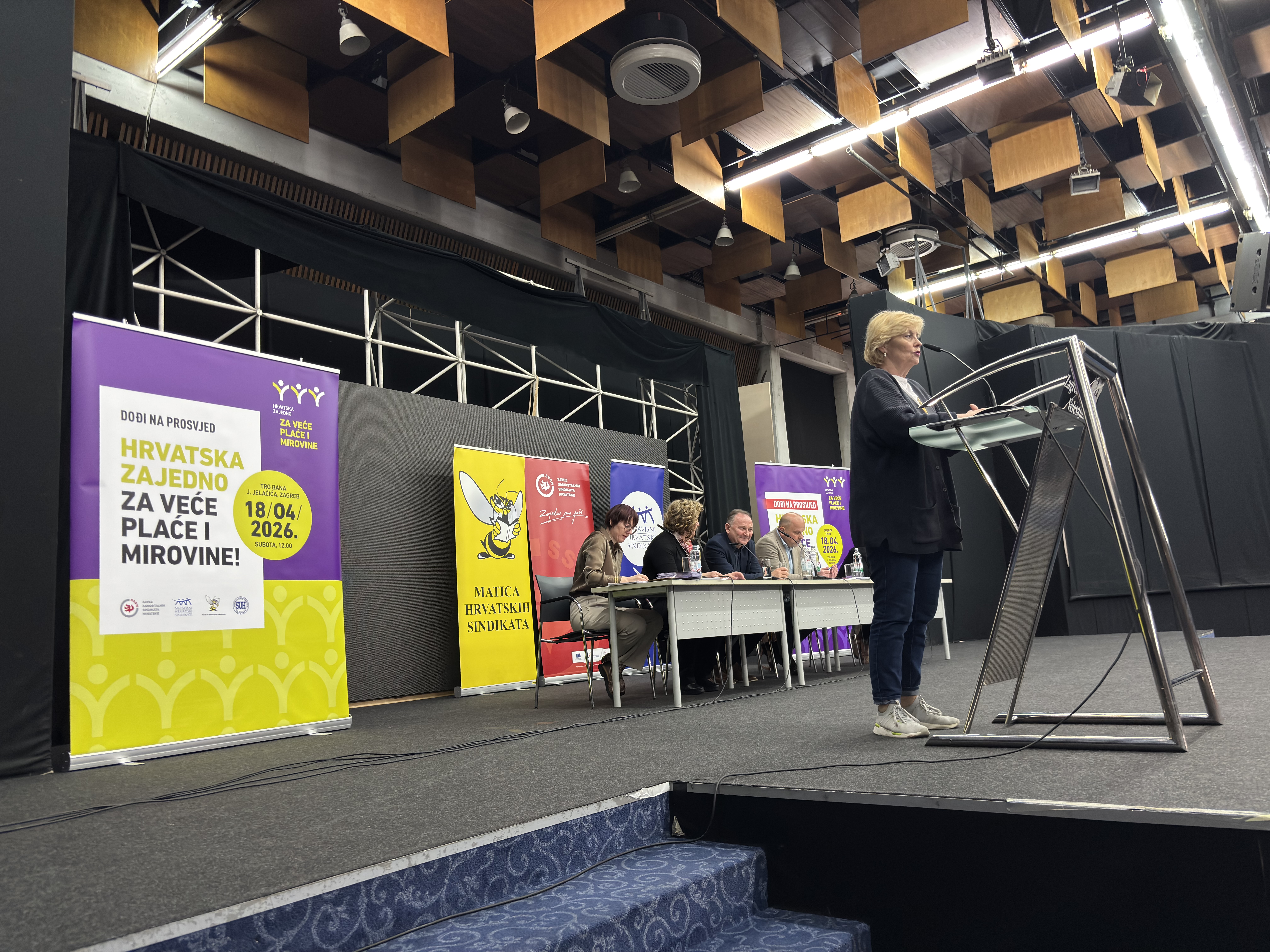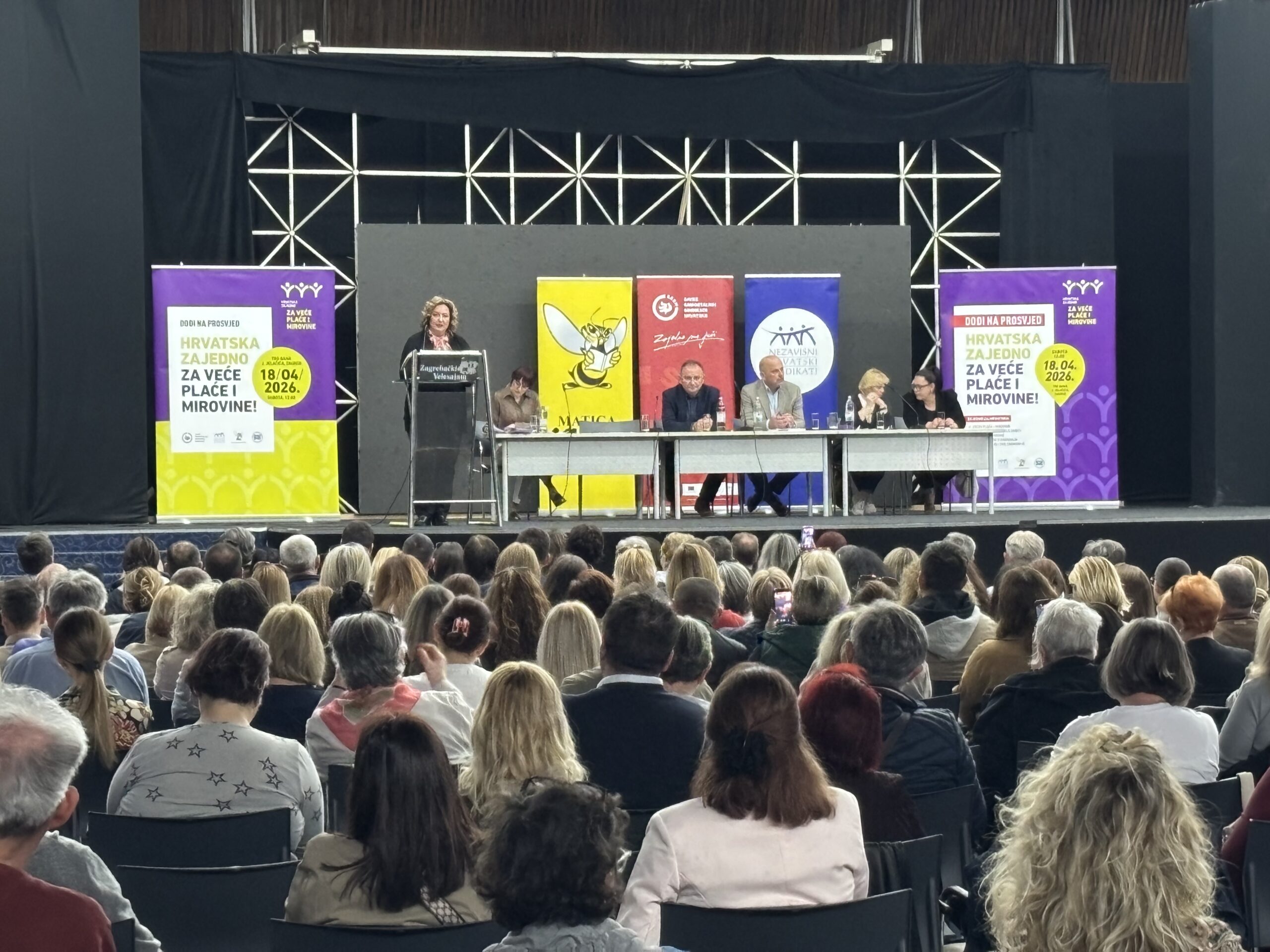 Posljednji pripremni skup uoči prosvjeda “Hrvatska zajedno za veće plaće i mirovine”, u organizaciji Matice hrvatskih sindikata, Nezavisnih hrvatskih sindikata, Saveza samostalnih sindikata Hrvatske i Sindikata umirovljenika Hrvatske, održan je u Zagrebu 9. travnja 2026. te je okupio više od 500 sindikalnih povjerenika.