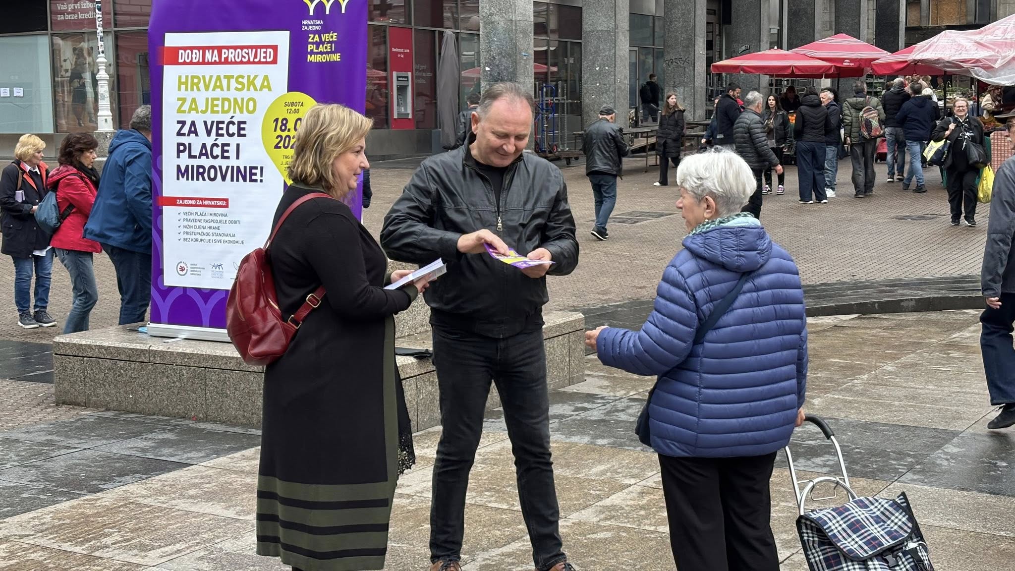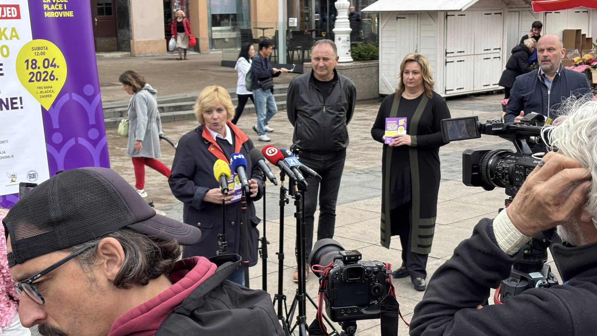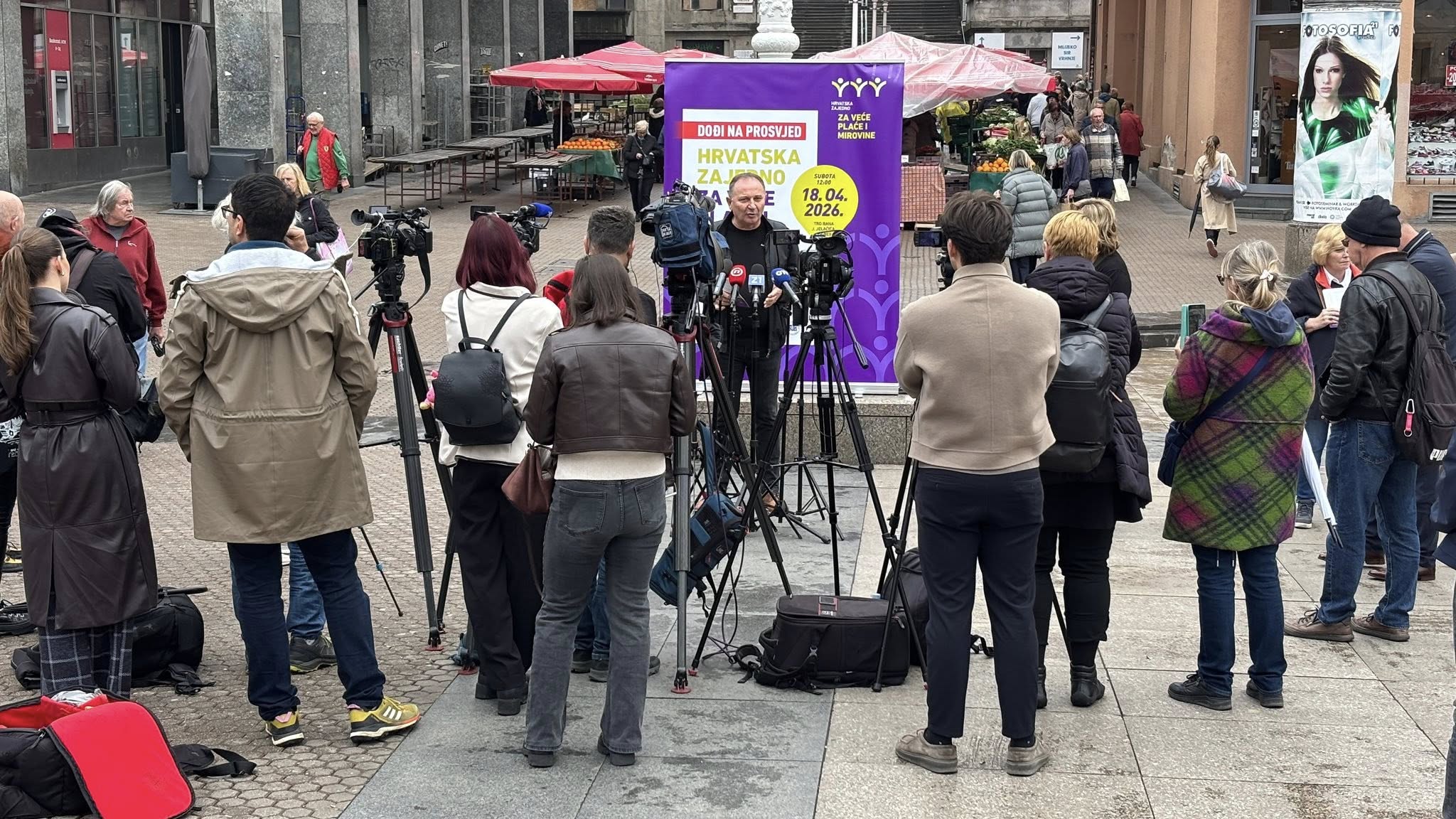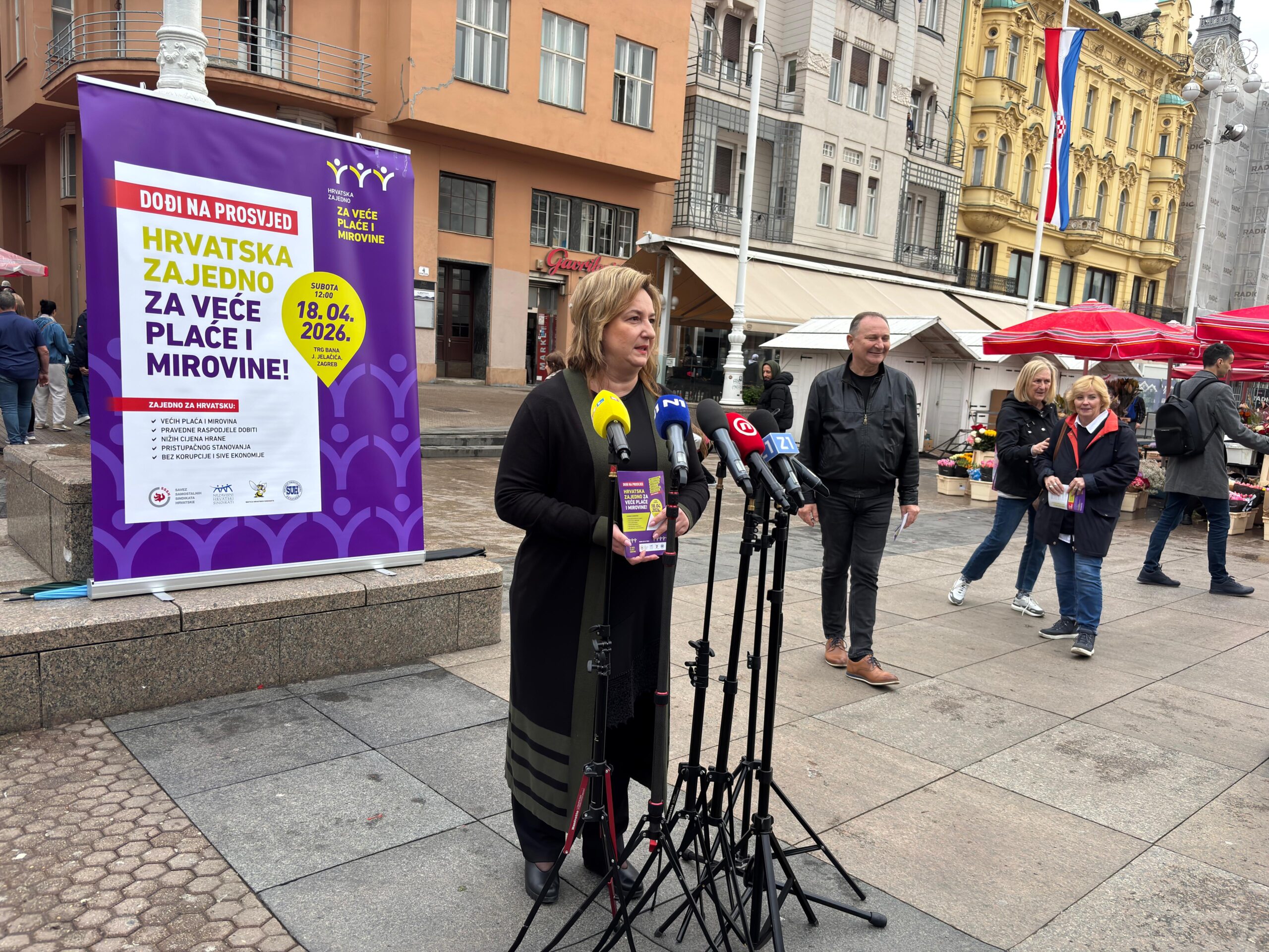 Uoči prosvjeda „Hrvatska zajedno za veće plaće i mirovine“, koji će se održati u Zagrebu, 18. travnja 2026., sindikalne središnjice Savez samostalnih sindikata Hrvatske (SSSH), Nezavisni hrvatski sindikati (NHS) i Matica hrvatskih sindikata (MHS) te Sindikat umirovljenika Hrvatske (SUH) održale su 15. travnja završnu tiskovnu konferenciju na Trgu bana Josipa Jelačića gdje su se družili sa građanima i dijelili informativne letke.
