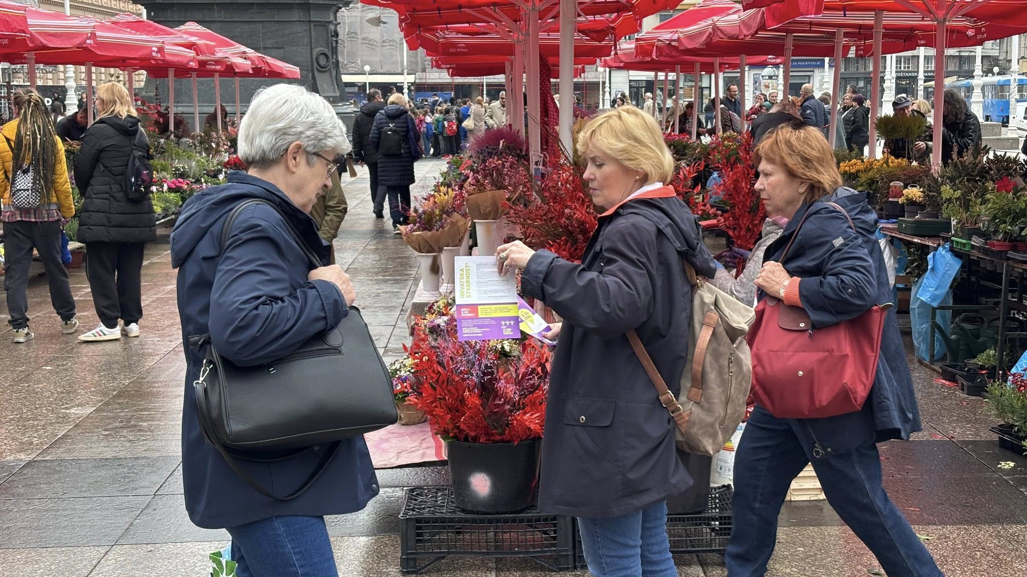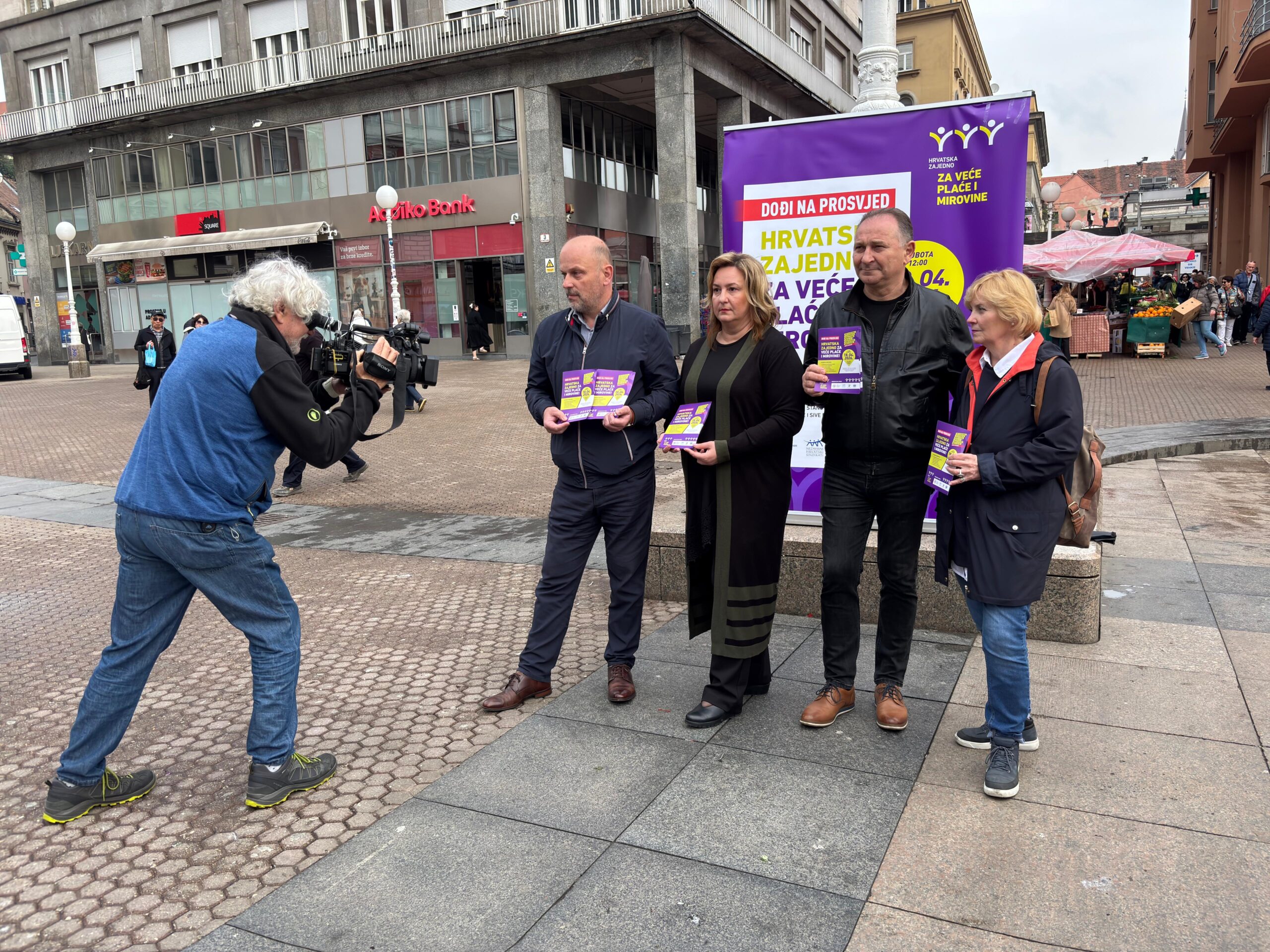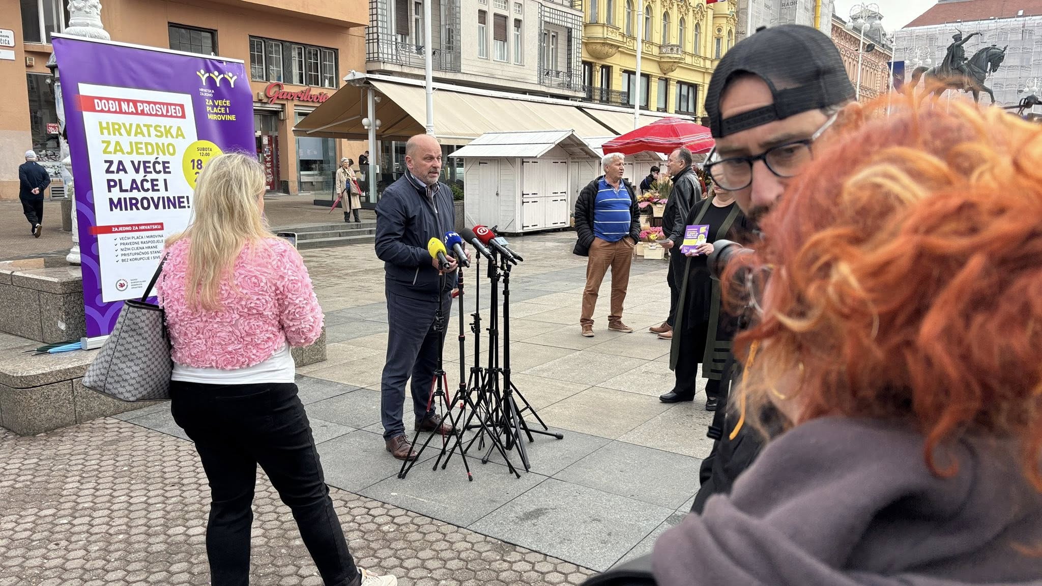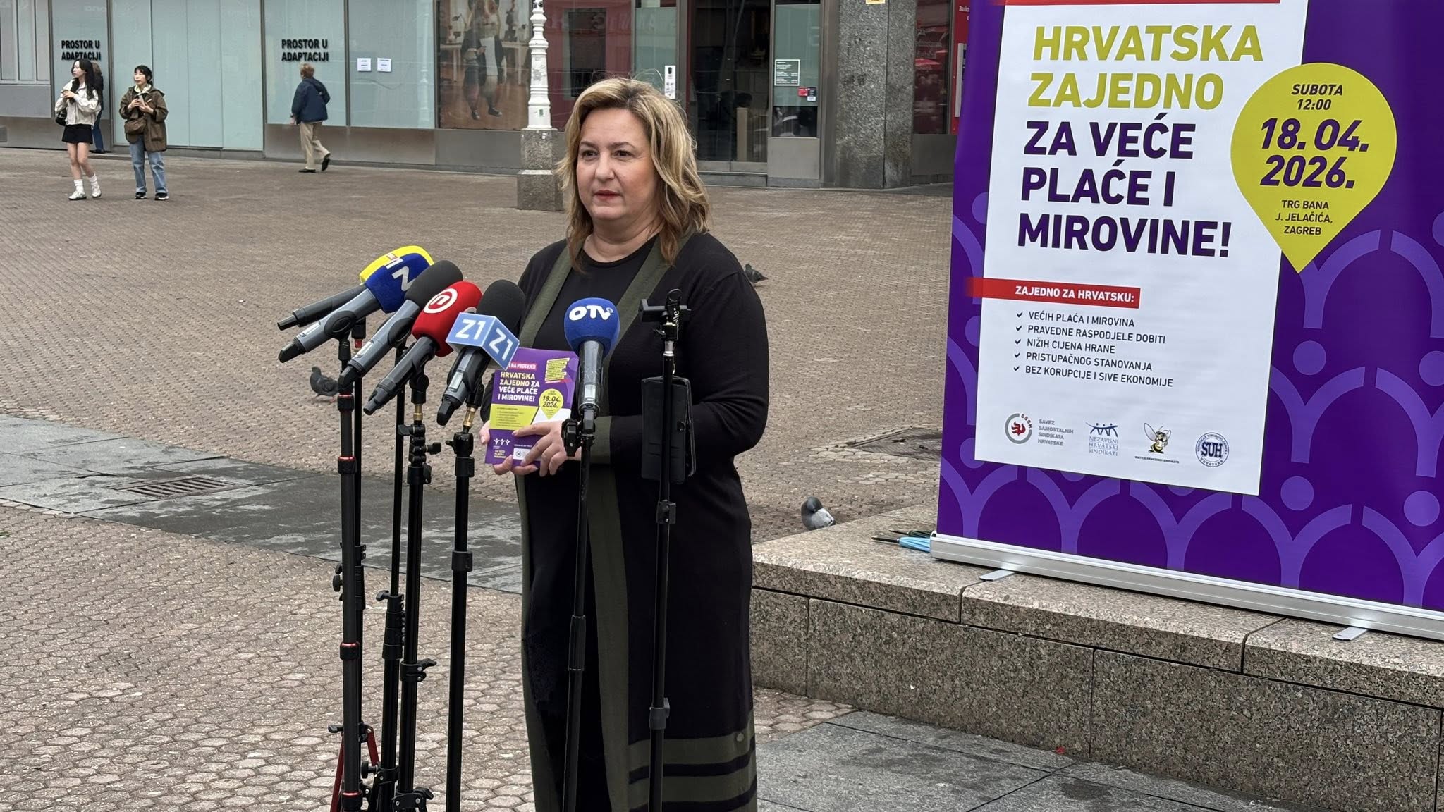 Uoči prosvjeda „Hrvatska zajedno za veće plaće i mirovine“, koji će se održati u Zagrebu, 18. travnja 2026., sindikalne središnjice Savez samostalnih sindikata Hrvatske (SSSH), Nezavisni hrvatski sindikati (NHS) i Matica hrvatskih sindikata (MHS) te Sindikat umirovljenika Hrvatske (SUH) održale su 15. travnja završnu tiskovnu konferenciju na Trgu bana Josipa Jelačića gdje su se družili sa građanima i dijelili informativne letke.